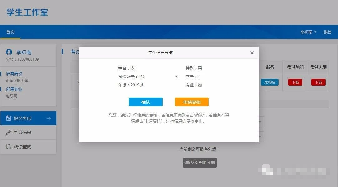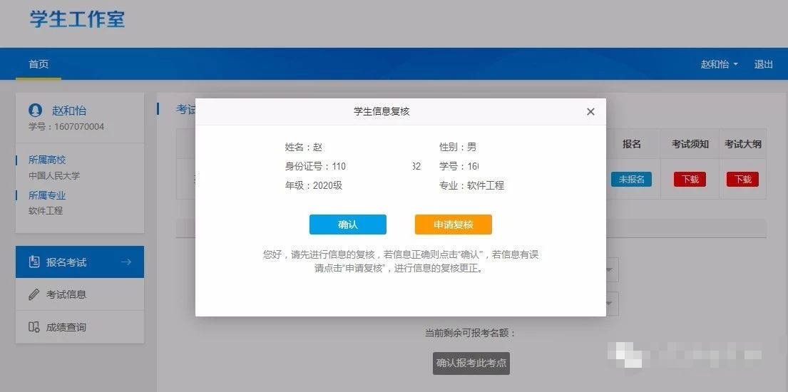 学生首次登陆工作室,未对个人信息进行过复核的学生,其登录工作室后,系统自动弹出信息核对的页面,若信息无误,则点击“确认按钮。