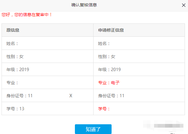 若信息有误,则在信息栏右侧输入更正后的信息,并点击“申请复核”,提交复核信息。如下为点击后,信息确认的页面,针对申请复核的信息,高亮显示。