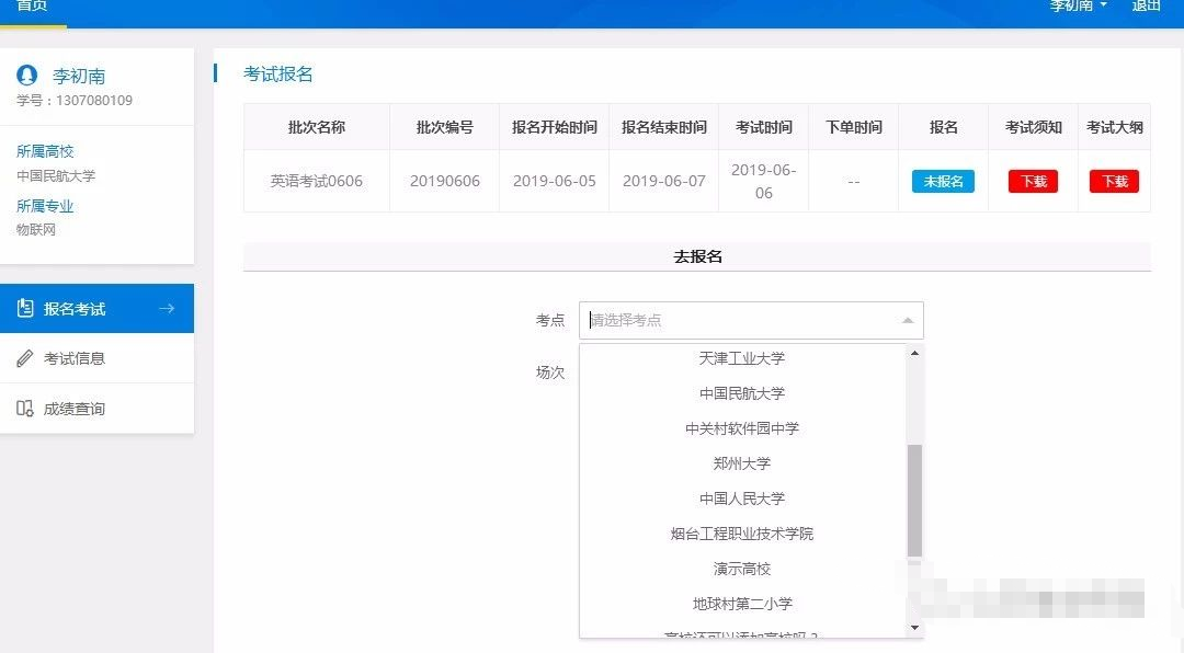 当学生报名时,即可选择某一个考点,及此考点的某一场次,进行报名。每一场有可容纳的考生数量,本考点当前场次报名数量未满时,无法报名下一场次。当本考点当前场次报名人数已满,考生也无法再报考当前考点的当前场次。