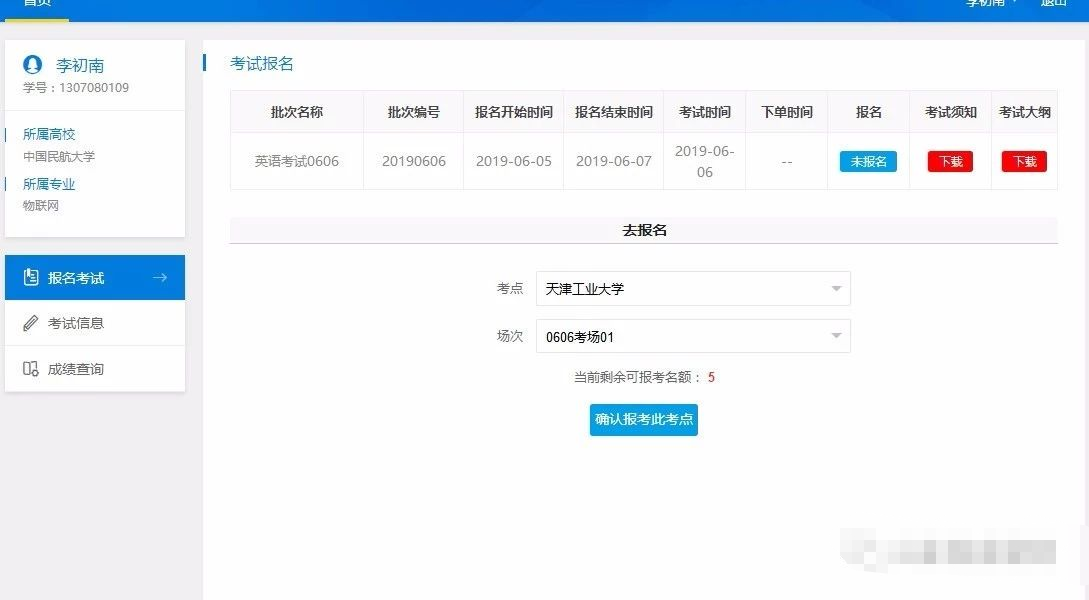 点击“报名考试”栏目,即可看到当前批次的考试信息,并且点击下载,即可完成考试须知,考试大纲的下载浏览。