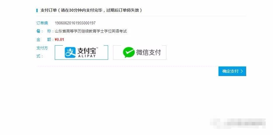 点击“确认报考次考点”后,进入订单页面,支持进行支付宝支付或者微信支付两种形式,可自由选择,当所选方式外边框标为蓝色,即为当前选中的缴费方式,点击“确定支付”,即进入支付页面。