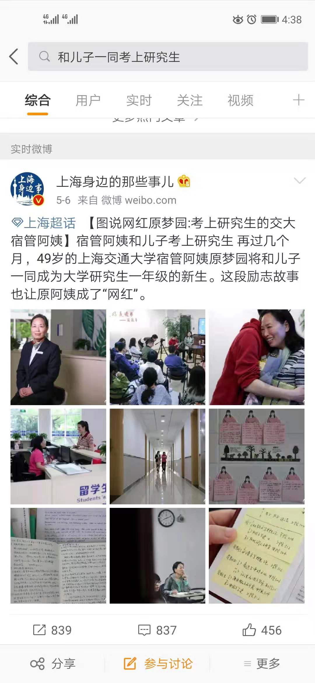据了解,她曾就读于信阳师范学院的生物专科,于1989年正式毕业;2016年顺利通过成人高考,进入复旦大学汉语言文学本科继续学习;2018年应聘为上海交通大学留学生公寓的一名前台,而在此之前,她就一直坚持旁听上海交大的汉语言和英语专业课程;2019年,她与儿子一同考研成功,被拟录取为广西大学汉语国际教育专业硕士研究生。她就是原梦圆。