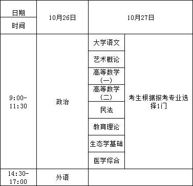所有统考科目每科试题满分均为150分;高起本、高起专的统考科目每门考试时间为120分钟,专升本每门考试时间为150分钟。具体考试科目及时间如下: