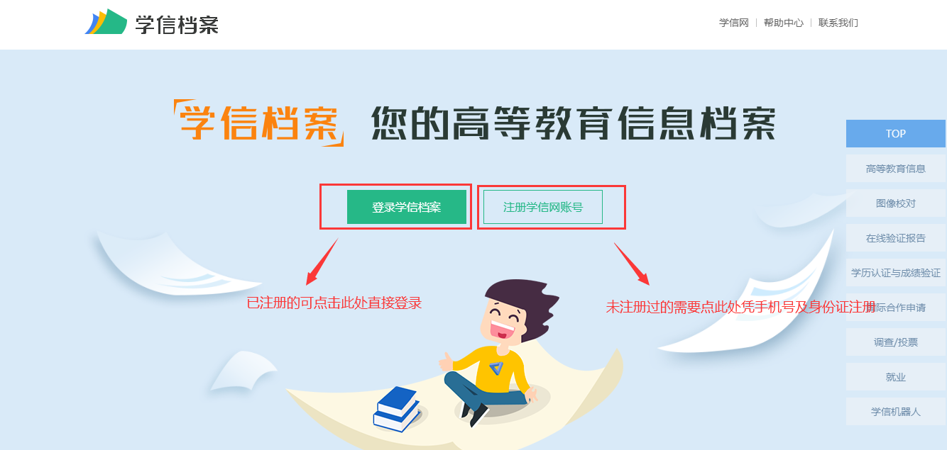 1、已成功注册账号的,可以直接点击登录【登录学信档案】;2、在此之前未注册过学信网账号的,点击【注册学信网账号】,进入注册的界面,完成新账号注册。