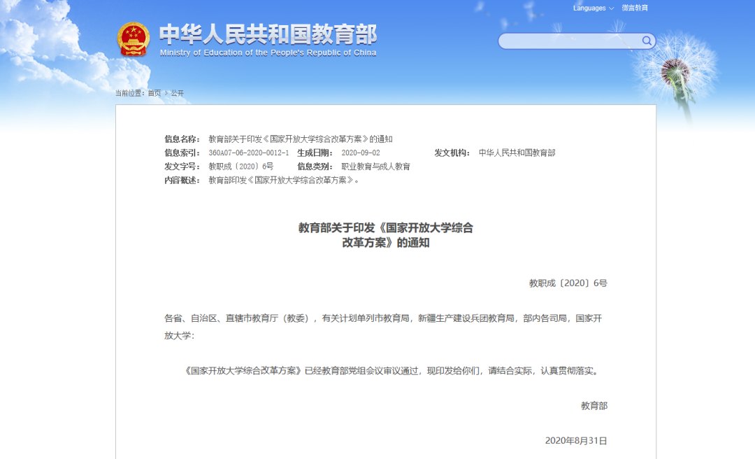 按照教育部相关部署,全国39所省级广播电视大学统一更名为“省域名或城市名+开放大学”,并于2020年12月底前报教育部备案。